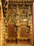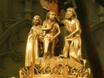 Ailleurs, on trouve aussi un grand lutrin en forme d’aigle, et d’immenses fonts baptismaux en cuivre, ornés de petits personnages (ill. 10), dont un saint Georges délivrant une princesse vêtue d’un chapeau coupé à la manière voyante de la cour de Bourgogne. Une chapelle latérale renferme un beau retable, taillé par le sculpteur officiel de Charles Quint. On voit aussi la touchante et maladroite représentation d’un minuscule bébé, le deuxième fils décédé de celui qui allait devenir Louis XI de France et serait surnommé par ses ennemis : « l’universelle aragne », l’araignée universelle, pour sa ténacité et son habileté à réussir les négociations les plus difficiles. L’enfant est mort âgé de quelques mois, alors que Louis, pas encore roi, vivait depuis quelques années aux environs, exilé de France par son père et réfugié chez l’ennemi, à la cour de Bourgogne, pendant un de ces épisodes confus qui ont émaillé la guerre de Cent Ans.