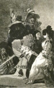 On y retrouve le célèbre cycle des « Caprichos », les « Caprices », des planches qui datent des années 1790, une époque où l’artiste était peintre de cour et fréquentait les plus hautes sphères du pouvoir, multipliant les commandes et portraits officiels. Un succès éclatant qui masquait de profondes contradictions : à titre privé, Goya était rationaliste dans un pays très bigot où sévissait encore l’inquisition, progressiste dans un milieu conservateur, arrivé à son poste par son seul mérite dans une société où la naissance, noble ou roturière, dictait généralement les destinées. Il rêvait d’un futur différent pour la nation et, même parvenu au faîte de la renommée, il portait un regard acéré sur la décomposition de la société, affligée des mêmes maux qui, en France, avaient mené à la révolution.