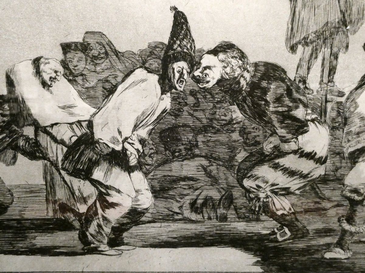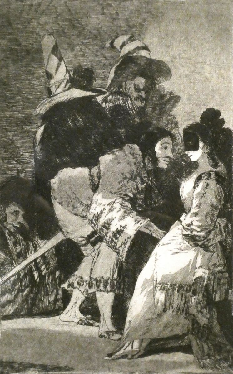 Dans cette dernière série, avec une liberté technique difficilement surpassable, il montre surtout des rassemblements, des foules hagardes en proie à des passions extrêmes au cours d’événements énigmatiques qu’aucun titre gravé ne vient cette fois expliciter : bagarres d’ivrognes, émeutes, fiestas endiablées, crises d’hilarité ou de curiosité futile peuplées de faces bêtement réjouies s’y succèdent, révélées par des rais de lumière traversant des fonds sombres à l’aquatinte. Des petits groupes de gens y sont aussi montrés suspendus dans le vide, emballés dans des couvertures et nantis de maigres bagages, réfugiés sur une énorme branche, sans projet apparent ni autre endroit où ils pourraient se rendre. Même les taureaux, toujours très individualisés sur les planches de corridas, se retrouvent ici dans une multitude, tombant du ciel en pluie, entraînés par un mouvement de masse dont on ne peut deviner où il mène.