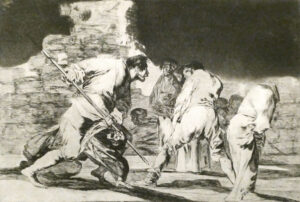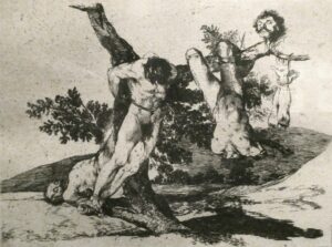 Le cycle des « Désastres de la guerre », gravé quinze à vingt ans plus tard emprunte souvent des voies plus littérales. Dans le pays ravagé par les campagnes napoléoniennes et les armées étrangères, Goya choisit de montrer le quotidien de la guerre à ras du sol, loin de toute vision glorieuse, héroïque ou épique. Le conflit y est représenté dans sa réalité crue, les victimes sont le plus souvent anonymes, livrées aux détrousseurs de cadavres, fauchées avec beaucoup d’autres sur un champ de bataille, torturées avec acharnement ou exécutées pour des broutilles : une dénonciation ou un couteau trouvé dans une poche. On ne distingue pas toujours les camps en présence, on n’y désigne pas obligatoirement des « bons » et des « mauvais » : la violence semble pénétrer la société à toutes les échelles, dégénérant à l’occasion en guerres communautaires ou villageoises, en vendettas et règlements de comptes privés. (ILLU 3)