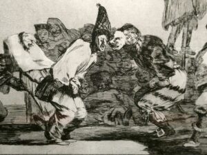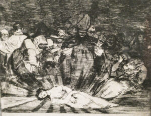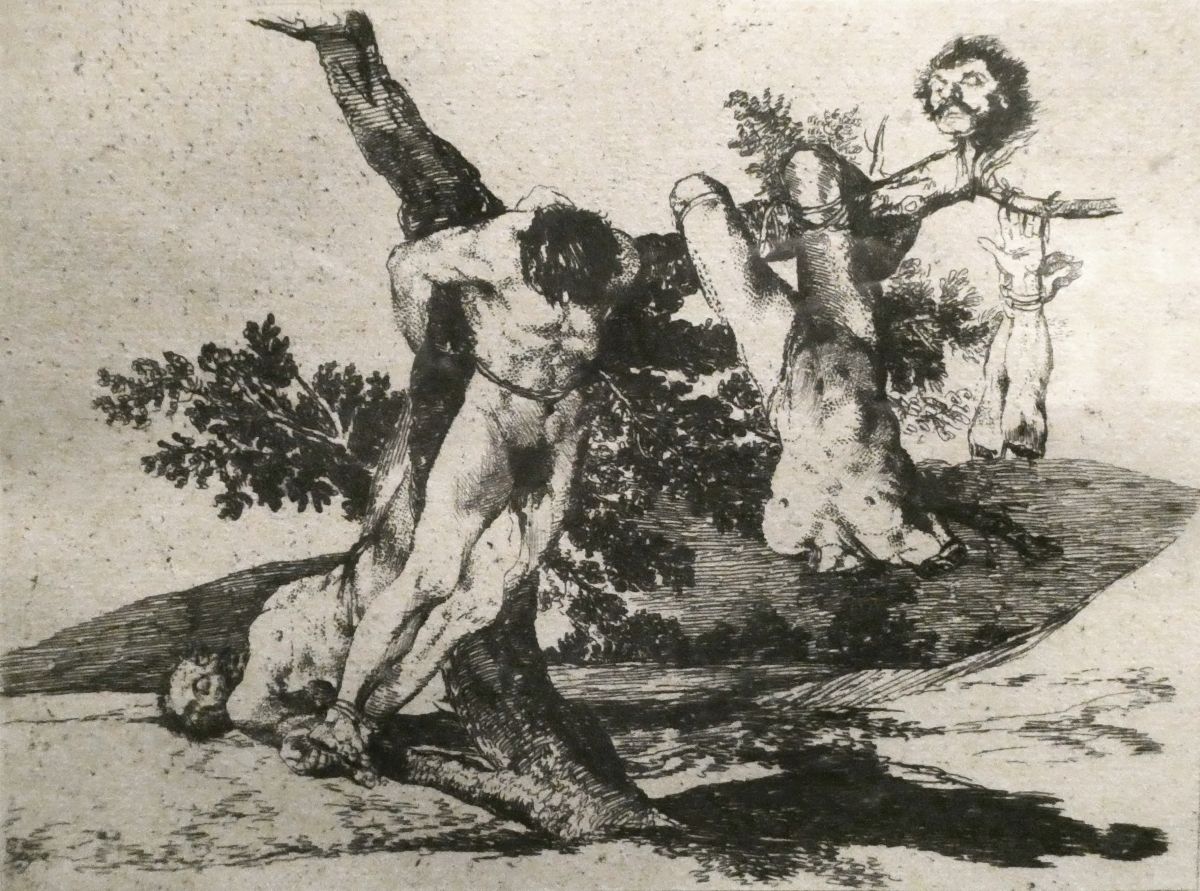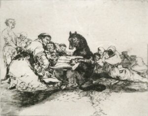 Le détour par l’imagerie grotesque est plus rare ici que dans les Caprices, peut-être parce que le peintre a moins ciblé les puissants du moment que l’absurdité et la confusion de la souffrance générale. On voit dans les images quelques loups plénipotentiaires rédiger et signer des traités dont on se doute qu’ils ne comptent pas les respecter, ou un religieux marcher en équilibriste sur une corde usée, obligé de ménager tous les camps faute de savoir où ira la victoire. Ailleurs, des manants agenouillés dans l’espoir d’un miraculeux sauvetage adressent des prières à un squelette costumé, promené sur un âne dans un cercueil de verre…