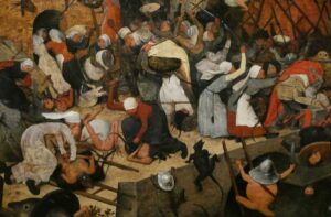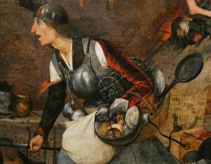 Pour évoquer les désordres de son temps, guerres de religion, occupation étrangère et autres calamités, Brueghel y a représenté une femme maigre et cuirassée traversant d’un air égaré un paysage dévasté, infernal. Elle traîne dans son errance un butin hétéroclite composé de bijouterie, d’objets de luxe, de vieux pots et d’une poêle à frire. Ici aussi, on voit en arrière-plan des foules civiles et militaires totalement grotesques, grimaçantes, monstrueuses, qui se livrent au pillage, s’affrontent et s’engagent dans des actions confuses, absurdes et cruelles, pour des résultats dérisoires, comme si la violence était devenue totalement irrationnelle, n’obéissant plus qu’à une logique propre. Malgré les évidentes différences de style et d’époque, la proximité des démarches des deux artistes ne pourra manquer de surprendre, laissant soupçonner qu’un mécanisme plus général de réaction face aux soubresauts de l’Histoire pourrait se trouver à l’œuvre. Bref, des visites à recommander, qui mériteraient de bénéficier d’une plus grande attention médiatique.