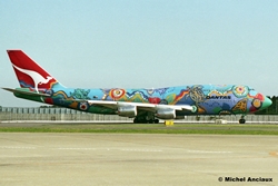 Dans le cadre des célébrations de son 75 anniversaire, la compagnie nationale australienne présenta en novembre 1995 le Boeing 747-338 VH-EBU « Nalanji Dreaming ». Ce mot qui, en langue aborigène, signifie « notre lieu », représentait l’équilibre et l’harmonie de la nature en Australie et les schémas s’inspirent des traditions culturelles ancestrales de l’Australie.