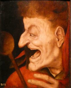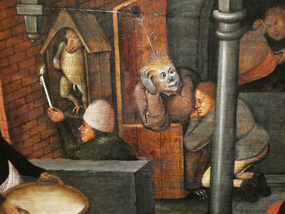 On remarquera que c’est au moment où se traite la laideur qu’apparaît dans l’accrochage des Beaux-Arts une plus grande présence masculine. C’est aussi à partir de là que l’exposition bascule vers le nord de l’Europe, héritier de la tradition gothique plutôt que byzantine. Les inventions grotesques étaient en effet très familières dans l’imagerie nordique et, à la Renaissance, on leur attribuera vite des rôles plus complexes que de servir de repoussoirs aux formes idéales dérivées de l’antique. On verra alors les figures populaires se libérer de l’opposition beau-laid pour se rapprocher d’un réalisme empreint de bienveillance, comme chez Brueghel, représenté ici (dans la version de son fils) par le panneau des Proverbes flamands, riche en détails savoureux.