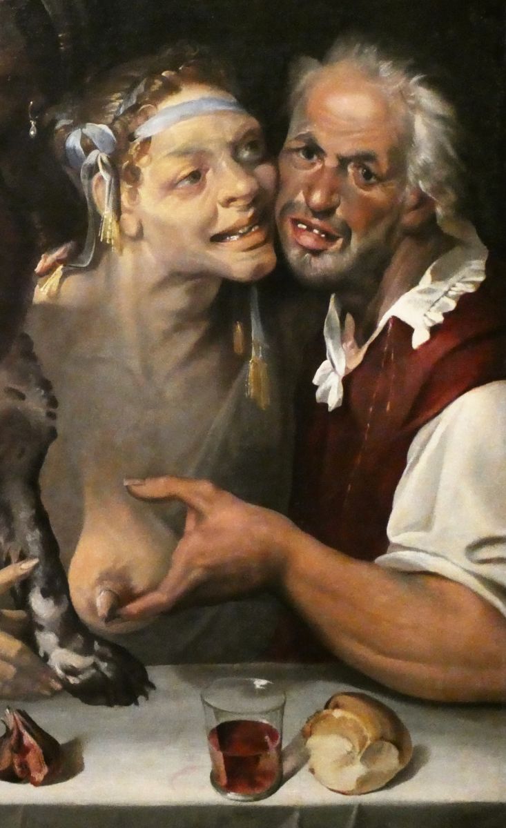 Dans un autre registre, à travers ces pays où une puissante bourgeoisie marchande s’affirme face à la noblesse, la laideur assumée sera mise au service d’un discours moralisateur subtilement subversif, critiquant plus volontiers les puissants que le peuple, dans le sillage de l’Éloge de la folie, d’Érasme, ou de la Nef des fous, de Brandt. On retrouvera donc ici avec plaisir quelques tableaux insolites. Dans cette perspective moralisatrice, l’exposition se termine avec d’amusants couples contrastés, dont une très belle série de peintures de Cranach montrant de très vieux clients et même clientes, ce qui est plus rare dans l’iconographie, en compagnie de jeunes beautés prostituées.